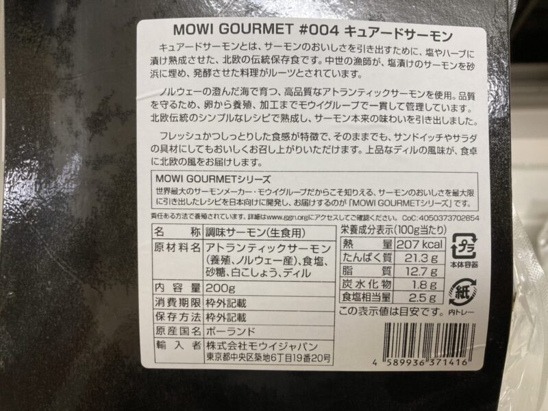 | 原材料 | アトランティックサーモン(養殖、ノルウェー産)、食塩、砂糖、白こしょう、ディル |